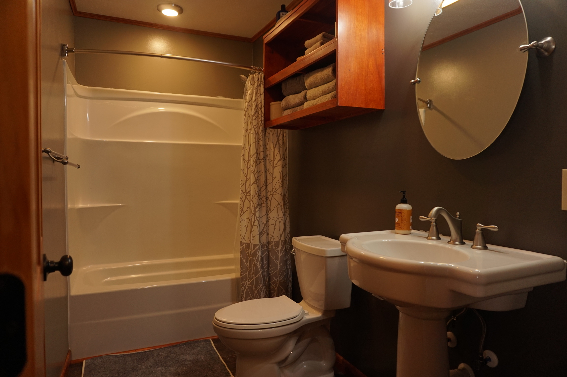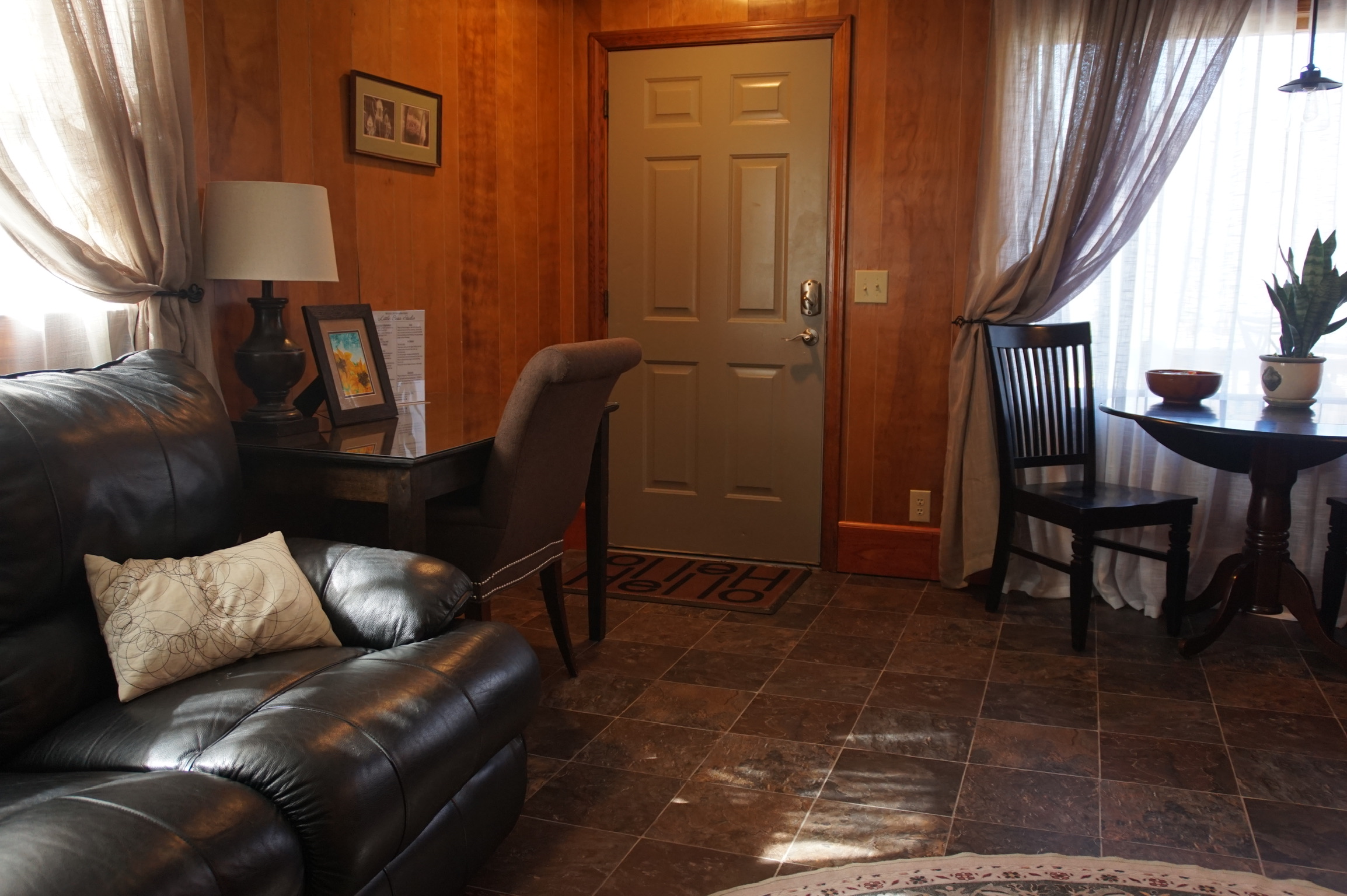 Little Bear Studio is a large newly rennovated common space wth an adjacent full bath. The common space features a comfortable queen size murphy bed, a full leather sofa, a full fireplace with electric insert and a dining area in front of a picture window. The room opens onto a small deck with an excellent view of the surronding landscape. Little Bear Studio is a comfortable and retreat from the world.