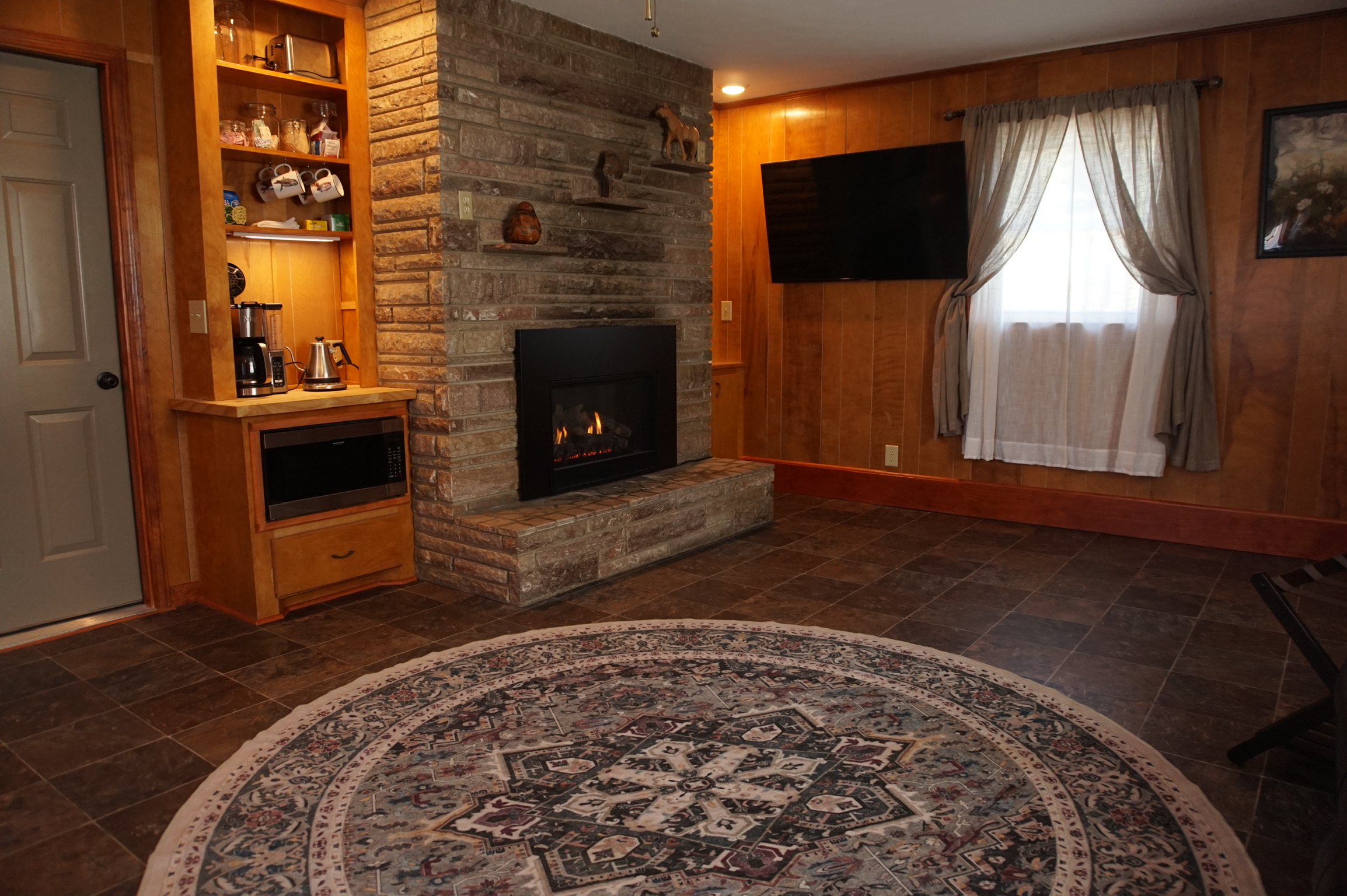 The full marble fireplace is old school and is a focal point of the room. We have added an electric insert that is almost the same as the real thing with all the convenience of modern technology, The flames dance behind the glass safely through the night keeping the studio toasty. Enjoy!